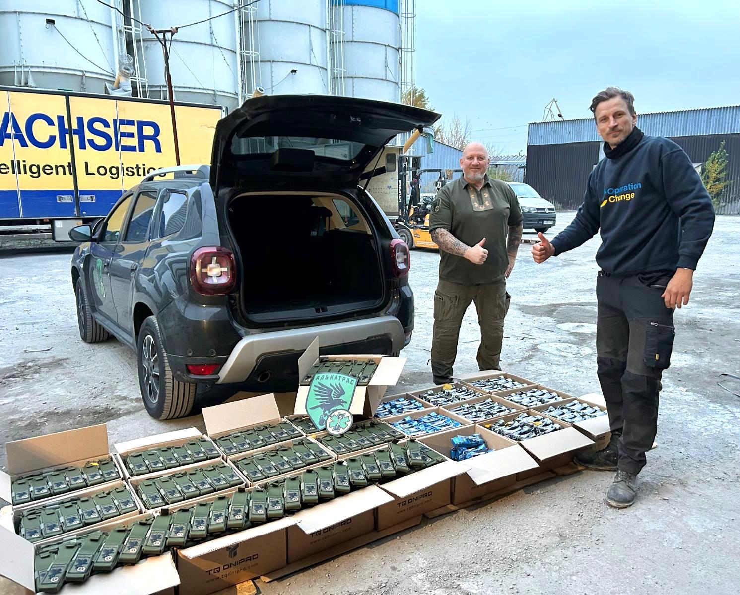 A large supply of tourniquets and pouches were sponsored by the Tullman Family Office, with 501c3 support from Elevate Ukraine, and project coordination by VM4U. Ludvig, Operation Change organization, performed 3rd party transparency measures by picking up, inventorying, and delivering over 1000 urgently requested tourniquets and pouches to Green Cross MedEvac. No VM4U donations were used.